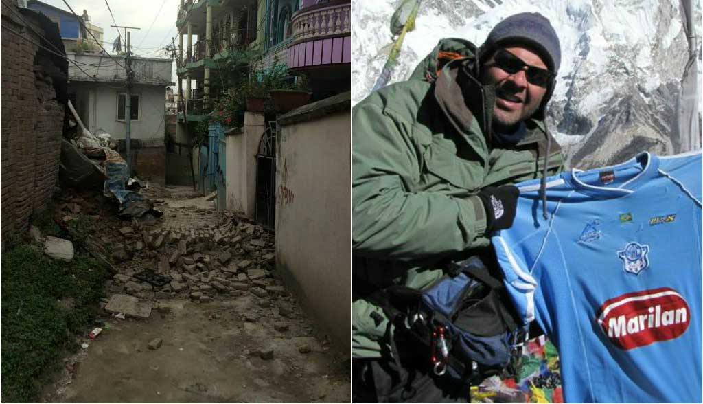 Mariliense com a camisa do MAC no Nepal e imagens da destruição causada pelo terremoto / Fotos: Aurélio Magalhães