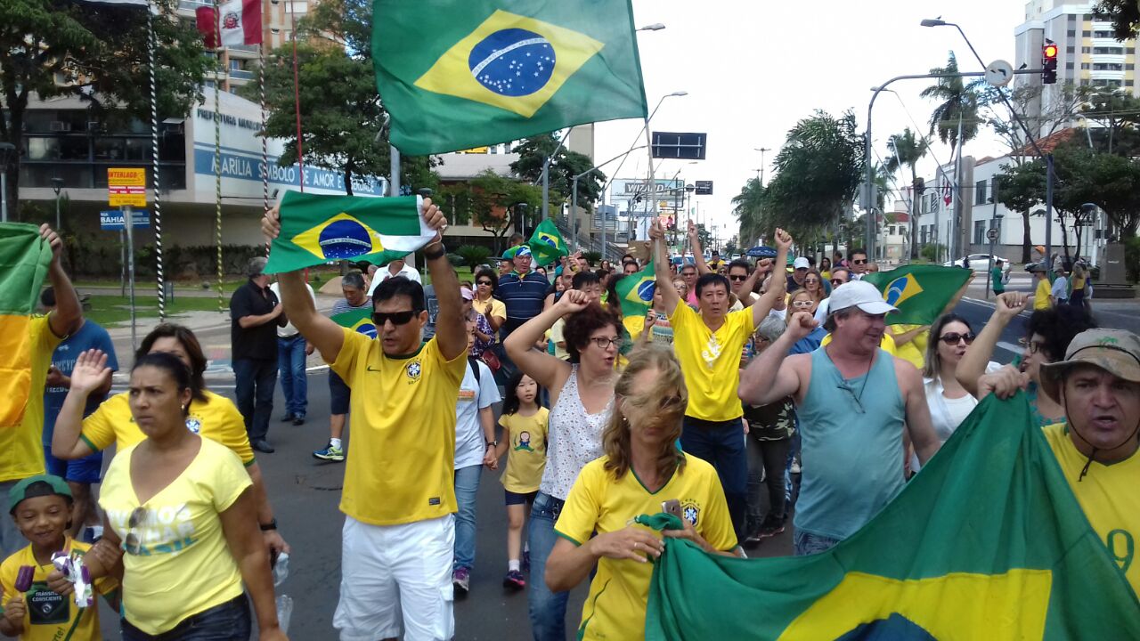 A grande maioria estava vestida de verde e amarelo e empunhando bandeiras do Brasil, lembrando os atos a favor do impeachment.