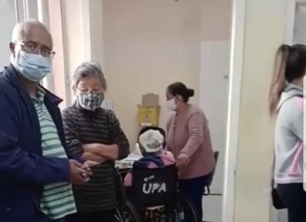 Em outra gravação, um idoso chora e se desespera. Ele chega de cadeiras de rodas em busca de atendimento.