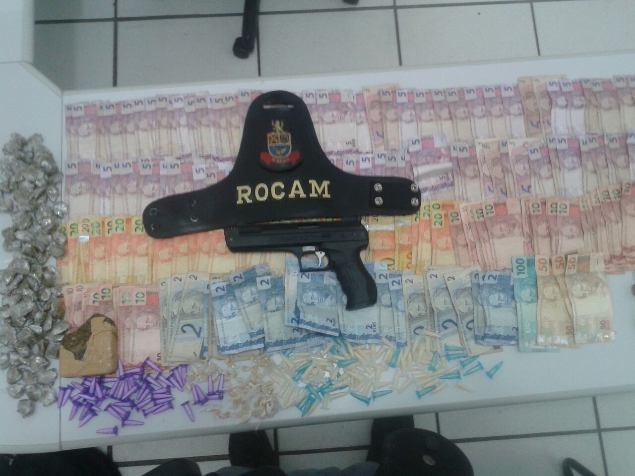 Com eles foram encontrados mais de R$ 2,1 mil, 106 porções pequenas de maconha, meio tijolo da mesma erva, 60 pedras de crack, 48 tubos com cocaína e uma réplica de pistola.