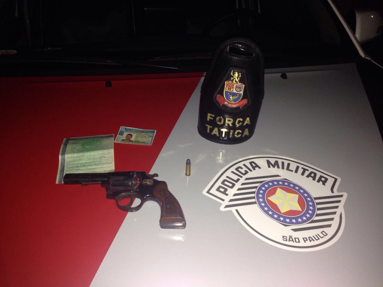 Durante vistoria no veículo foi localizado um revólver calibre 38, municiado e com a numeração raspada.