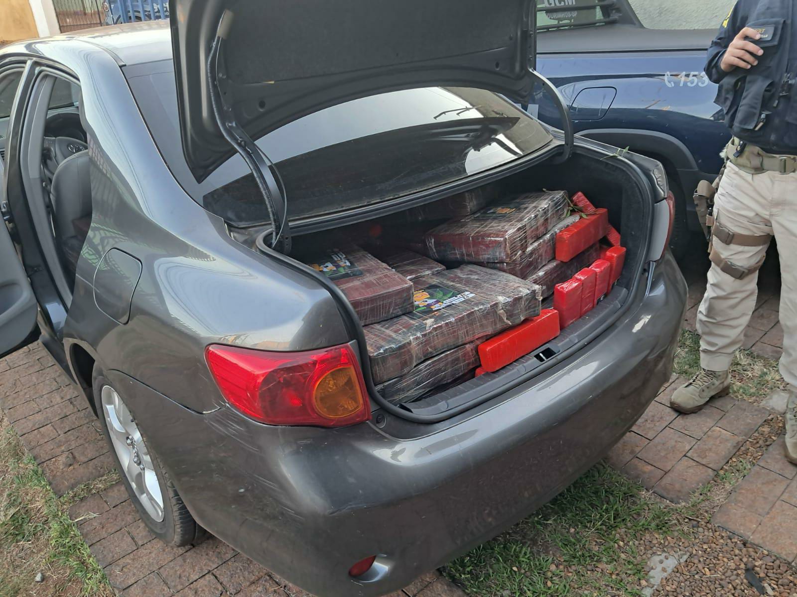 No interior do automóvel, os agentes encontraram a carga de maconha, distribuída em tijolos e armazenada no porta-malas. Durante a vistoria, também foi constatado que o carro utilizava placas clonadas. O veículo original havia sido furtado no último dia 5 de abril, em Campo Mourão (PR).