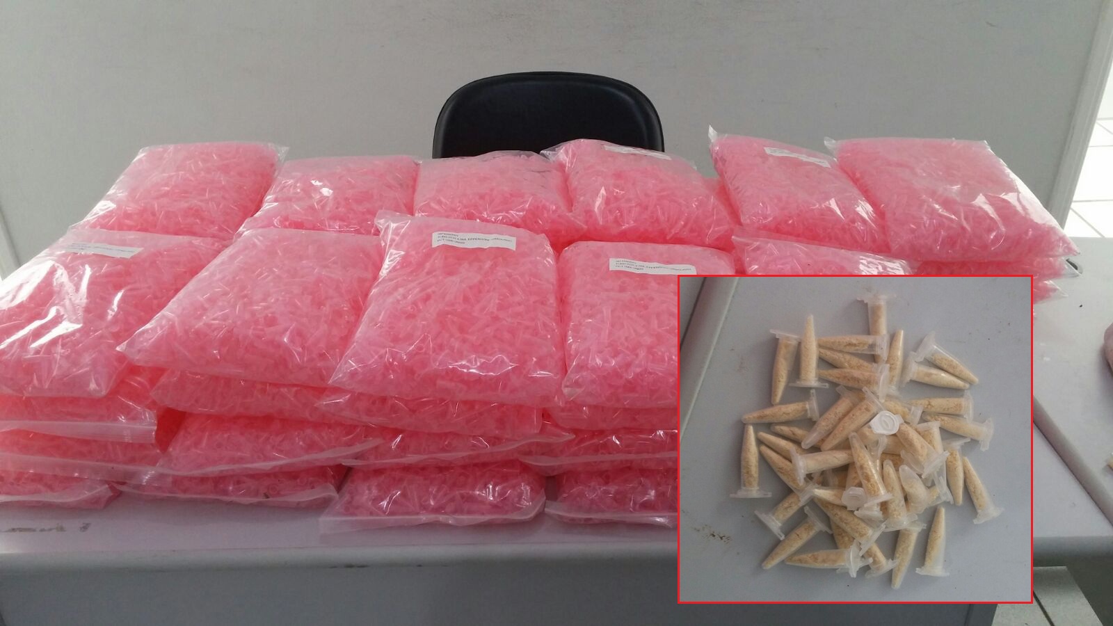 Segundo a Polícia Militar (PM), uma denúncia indicou que muita droga estaria enterrada no matagal que fica ao lado da rua. Os policiais fizeram uma varredura e acabaram encontrando somente os pinos plásticos que acondicionariam os entorpecentes: 43 mil pinos foram apreendidos na ação.