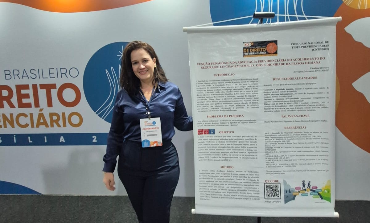 A mestranda em Direito da Universidade de Marília (Unimar), Carolina Silvestre, conquistou o 4º lugar no Concurso Nacional de Teses Previdenciárias, realizado durante o XIX Congresso Brasileiro de Direito Previdenciário, promovido pelo Instituto Brasileiro de Direito Previdenciário (IBDP), em Brasília. A premiação reconheceu um trabalho desenvolvido a partir das pesquisas do Programa de Pós-Graduação em Direito (PPGD) da Unimar, que une teoria e prática com foco na dignidade da pessoa humana.