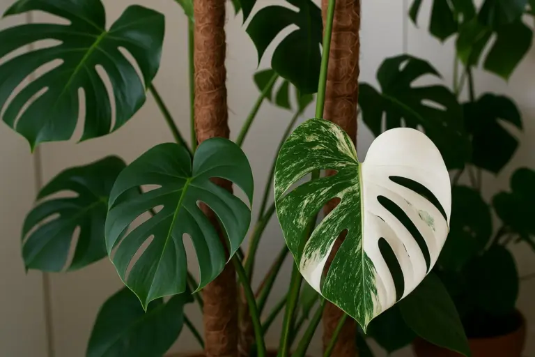 A monstera variegata, com suas manchas brancas ou amarelas nas folhas, precisa de cuidados ainda mais atentos. Por ter menos clorofila, sua capacidade de fotossíntese é reduzida, o que a torna mais exigente quanto à luz. Ela deve ficar em um local ainda mais claro, mas sempre sem exposição direta ao sol. Além disso, tende a crescer mais devagar e ser um pouco mais sensível a pragas e doenças.