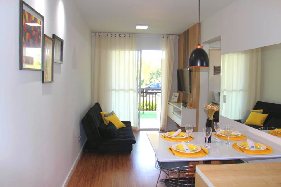 Cada apartamento tem dois dormitórios, cozinha, salas de estar e jantar, infraestrutura para ar condicionado, varanda e elevador, além de uma vaga de garagem.