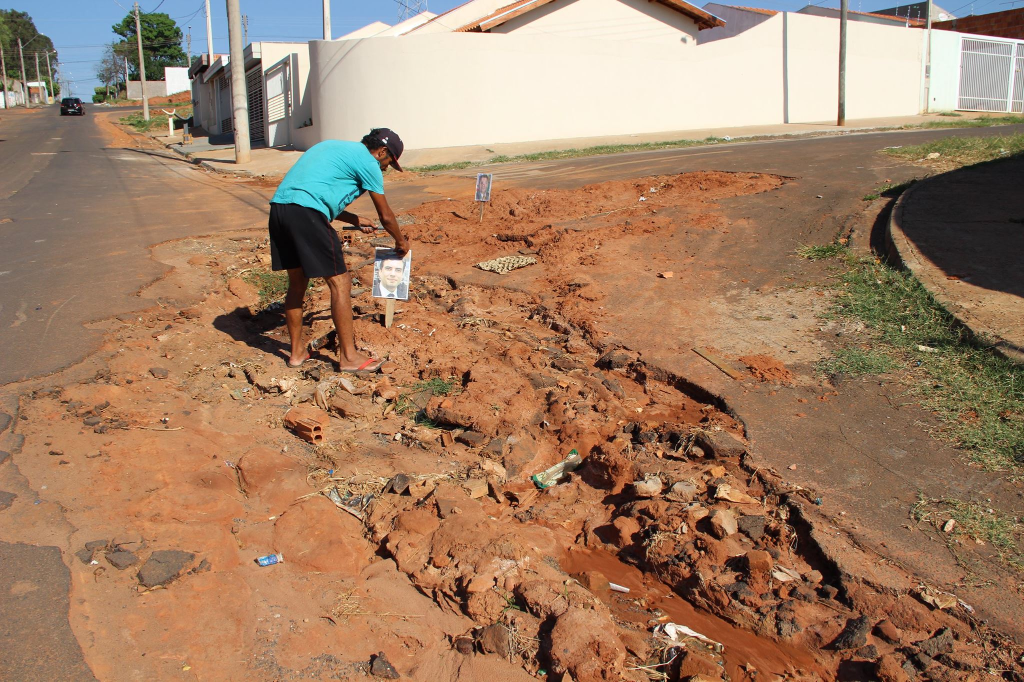 Para protestar contra o abandono do bairro, morador do Santa Antonieta, zona norte de Marília, utiliza fotografias do prefeito Vinícius Camarinha (PSB) e do vereador Samuel da Farmácia (PR).
