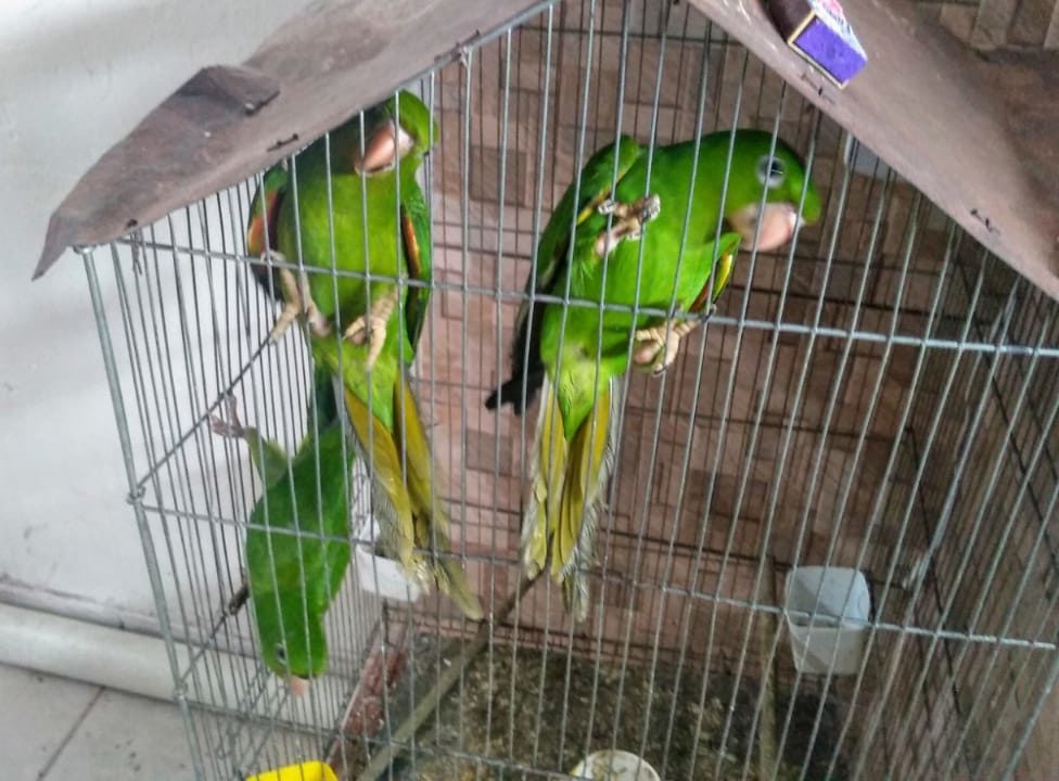Segundo a Polícia Militar Ambiental, após denúncia, policiais se deslocaram até a rua João Antônio Duarte, onde houve a constatação de que três pássaros, da espécie periquitão maracanã, eram mantidos em cativeiro.