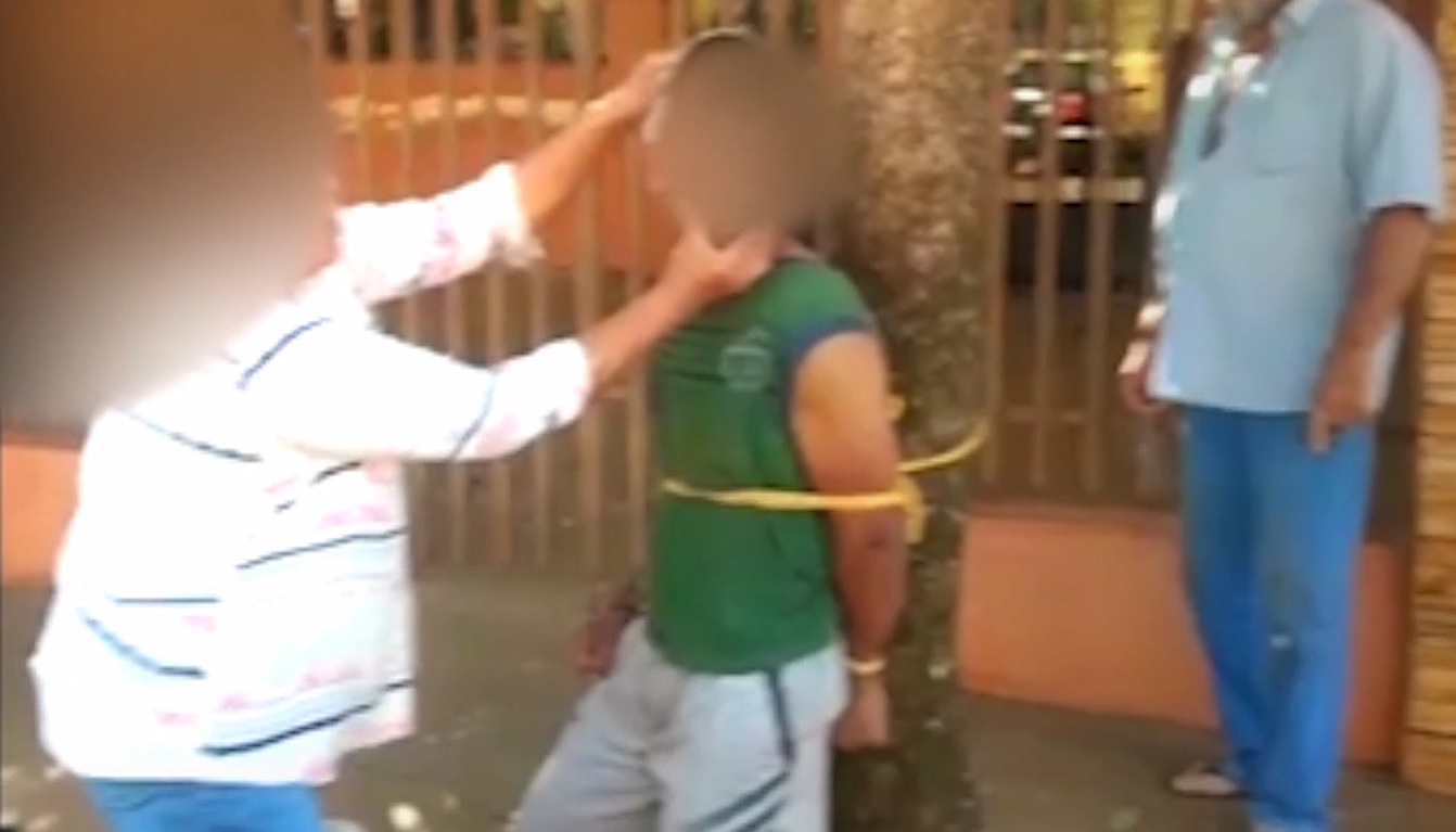 Os vizinhos revoltados com a situação amarraram o rapaz em uma árvore. Em seguida amarrado por uma corda ele foi levado até a delegacia.