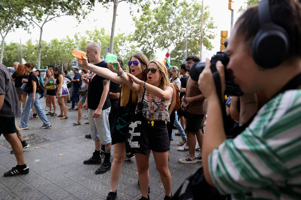 Munidos de pistolas de brinquedo, moradores revoltados contra o turismo se dirigiram aos pontos de principal fluxo da capital catalã e molharam clientes de bares e restaurantes que comiam em mesas ao ar livre. A manifestação aconteceu no último sábado (6).