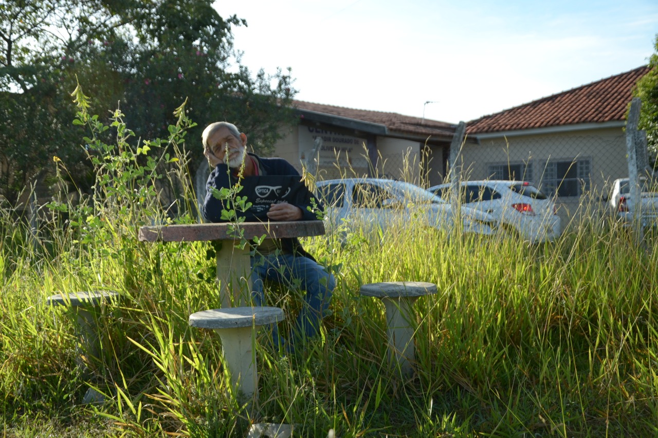 Lúcio Affonso Costa, 68 anos, em maio ao mato alto; ao fundo, Cras e Centro Dia do Idoso (Foto: Leonardo Moreno)
