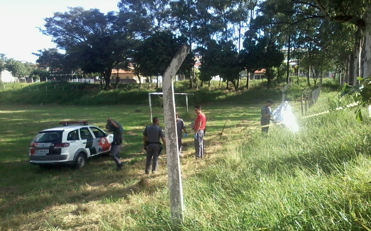 Polícia no campo de futebol onde o corpo foi encontrado (Foto: Divulgação)