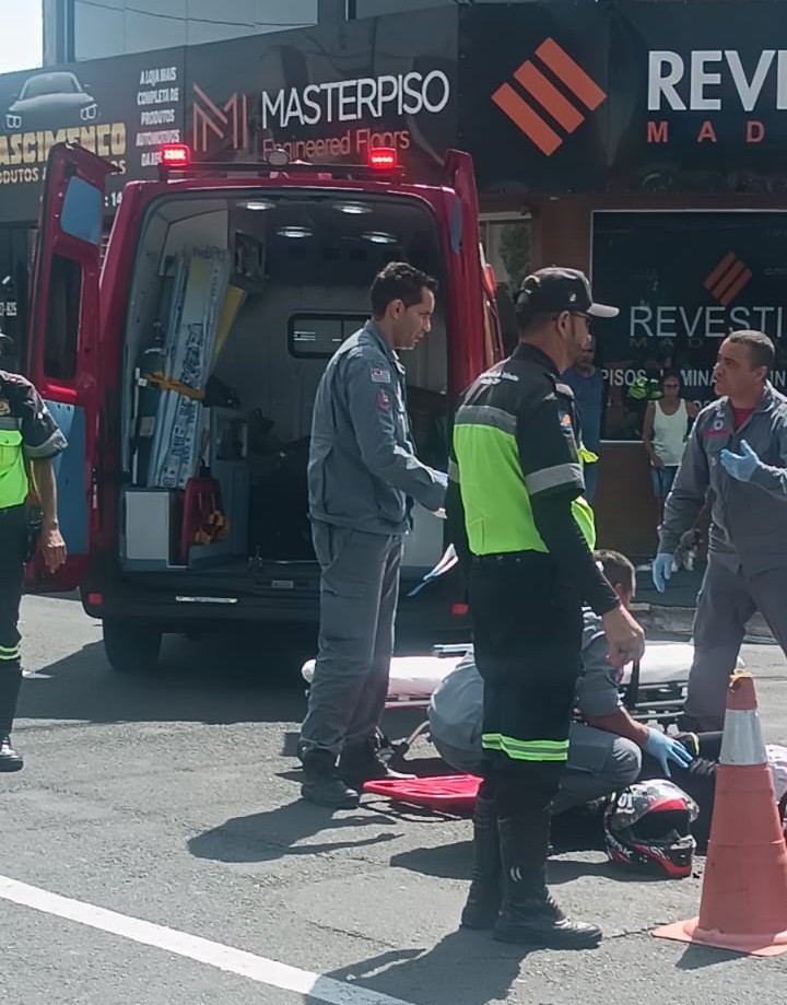 O motociclista recebeu atendimento no próprio cruzamento por equipes do Serviço de Atendimento Móvel de Urgência (Samu) e do Corpo de Bombeiros.