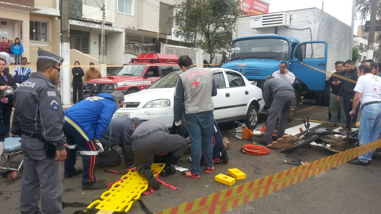 Com o impacto, a condutora da moto foi parar debaixo do automóvel. Foi necessário uma equipe de salvamento do Corpo de Bombeiros para retirar a vítima da situação.