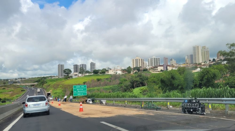 Motores para trator caíram de um caminhão na madrugada desta quinta-feira (12) na Rodovia Comandante João Ribeiro de Barros (SP-294), em Marília.