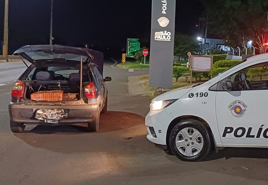 Durante a vistoria no veículo foram encontrados dois sacos com maconha escondidos no porta-malas. A carga foi totalizada em 80 tabletes da droga que somavam cerca de 40kg.