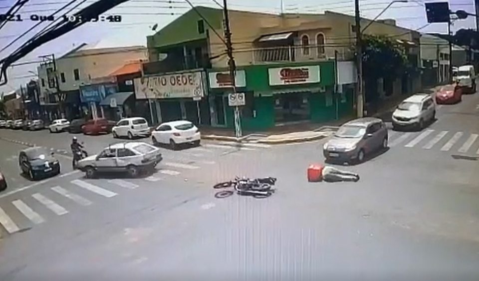 Câmeras de segurança registraram acidente envolvendo carro e moto na manhã desta última quarta-feira (24), em Tupã (distante 75 quilômetros de Marília).