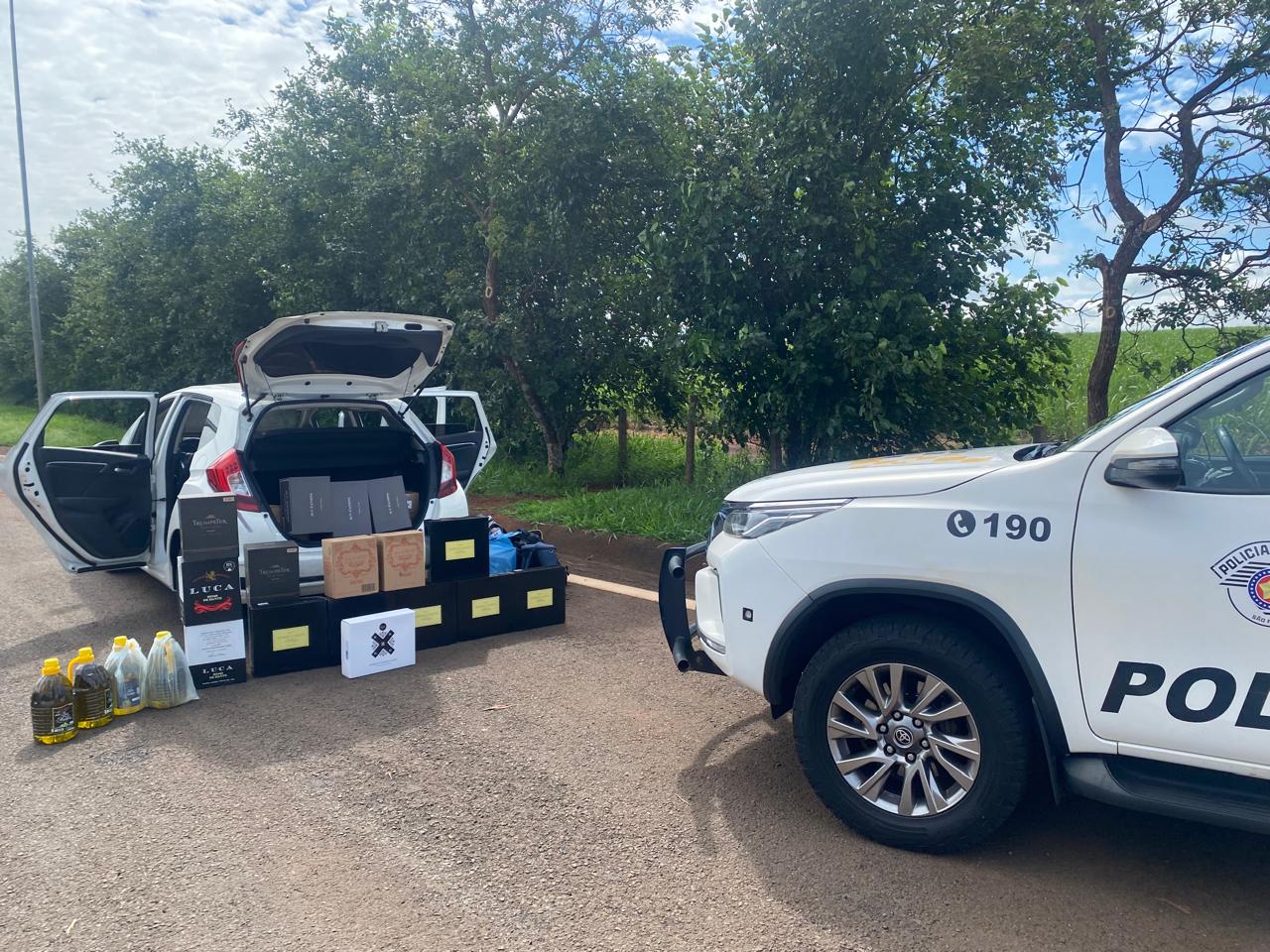 Policiais militares do grupo Tático Ostensivo Rodoviário (TOR), da Polícia Militar Rodoviária, apreenderam na manhã desta sexta-feira (6) dezenas de caixas com bebidas alcoólicas clandestinas, além de galões com azeite estrangeiro sem nota fiscal. As mercadorias estavam em um carro que seguia pela rodovia Orlando Quagliato (SP-327).