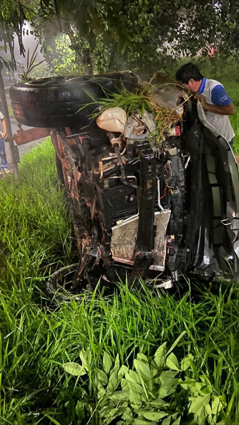Em seguida, ao chegar na rotatória – intersecção com a avenida das Roseiras -, para não atingir a traseira de um veículo que estava no “pare”, o condutor jogou o Citroën para o lado, quando atingiu os trilhos de proteção e capotou.