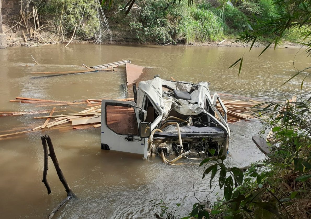 O Corpo de Bombeiros foi acionado no local, onde um caminhão carregado perdeu o controle da direção e caiu da ponte do Rio do Peixe.