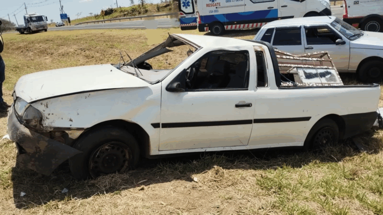 De acordo com o boletim de ocorrência do caso, policiais rodoviários foram acionados para atender a um capotamento envolvendo uma caminhonete VW Saveiro branca. No local, o veículo foi encontrado fora da pista, após o acostamento, com indícios de ter atravessado um barranco.