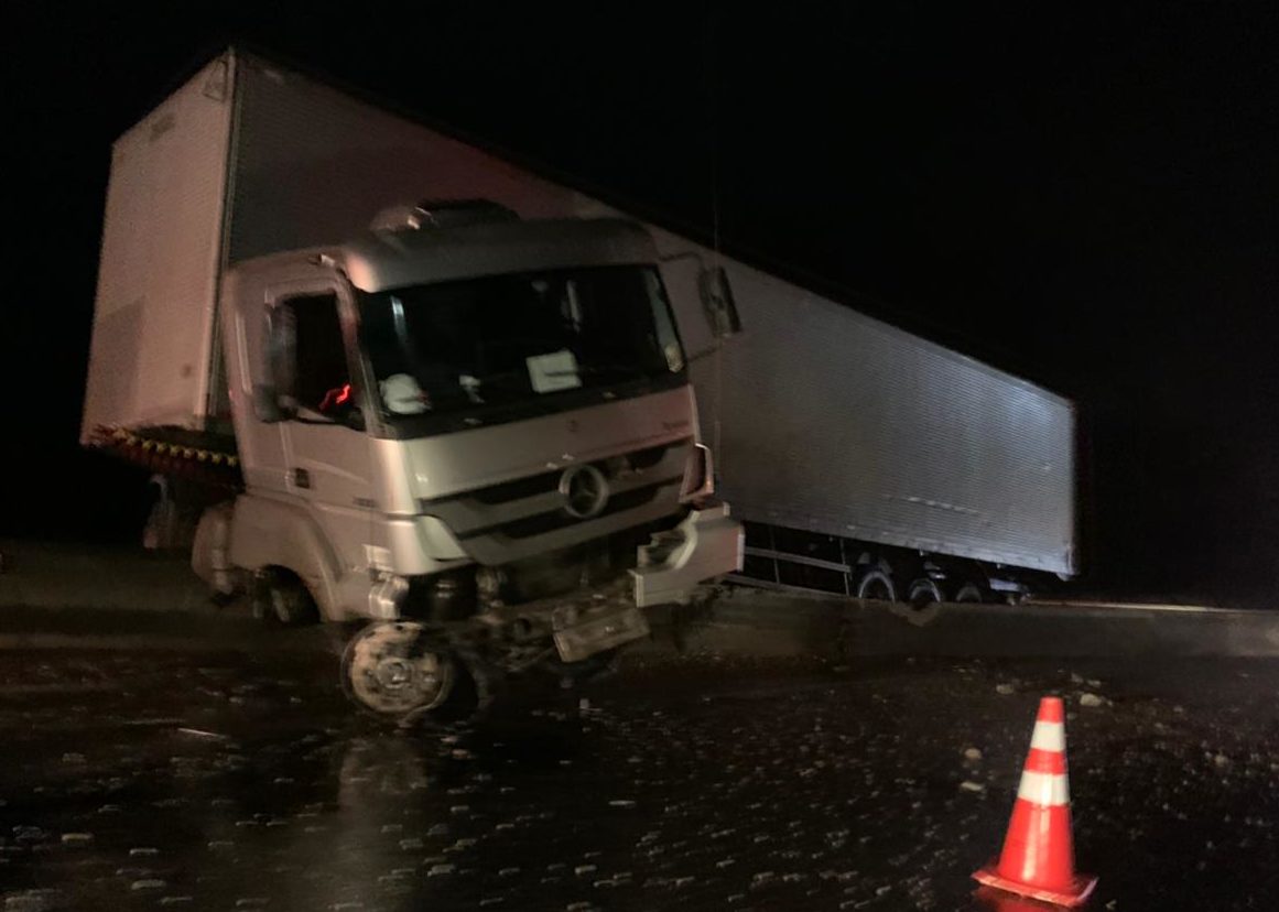 O motorista do caminhão perdeu o controle da direção e se chocou contra a mureta de divisão da pista. O condutor não sofreu ferimentos.