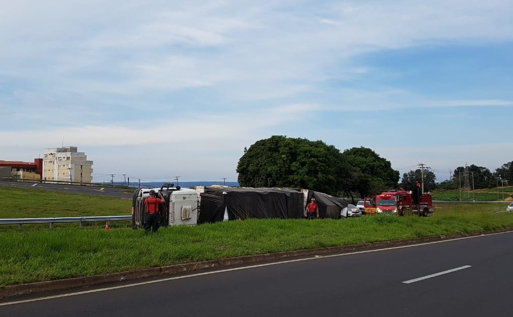 Um caminhão tombou na manhã deste sábado (4) na alça que dá acesso a rodovia Comandante João Ribeiro de Barros (SP-294), próximo da Unimar, zona Oeste de Marília.