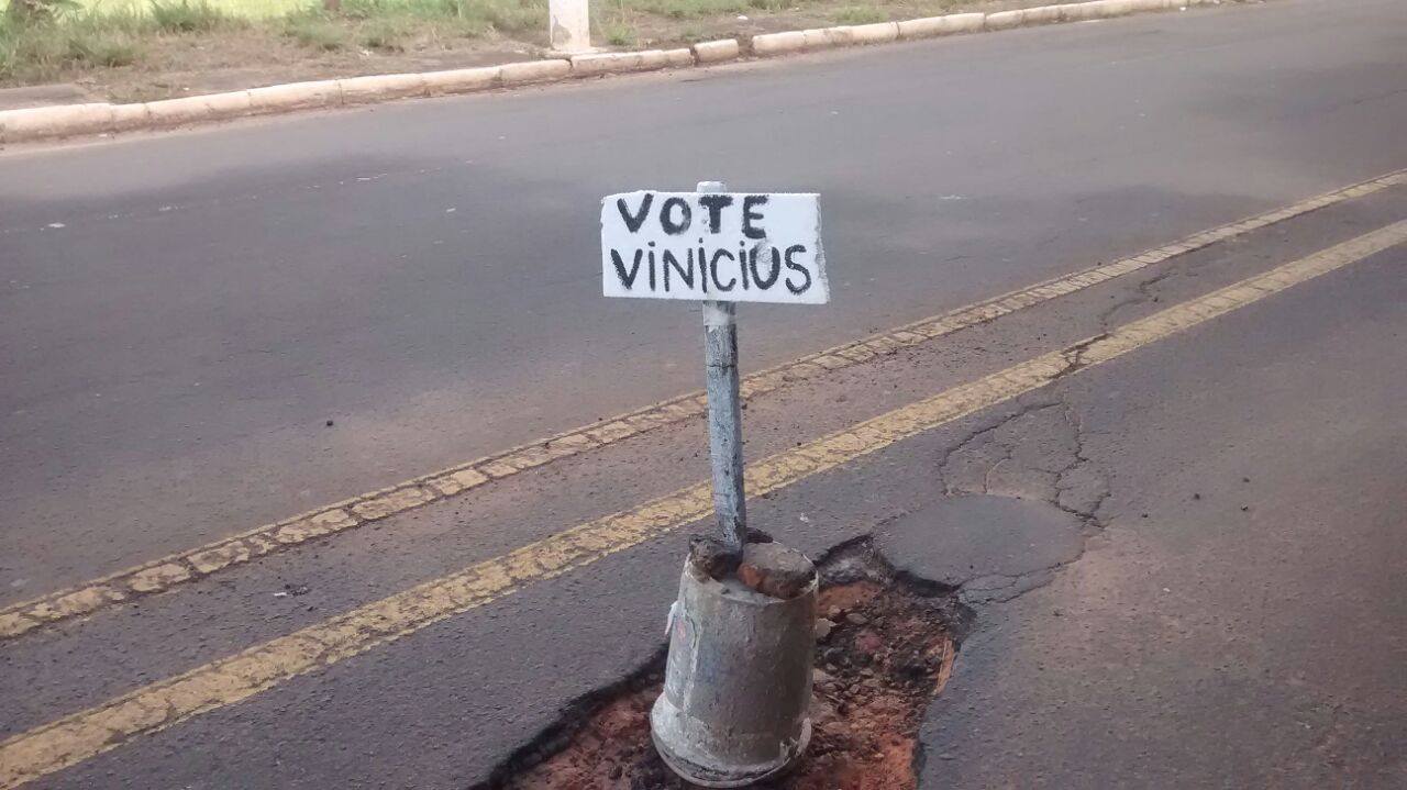 Uma placa com os dizeres ‘Vote Vinicius’, em alusão ao prefeito Vinicius Camarinha (PSB), foi fincada em um dos buracos. Relatos de moradores contam que o asfalto na avenida e em várias partes da zona leste estão em péssima situação.