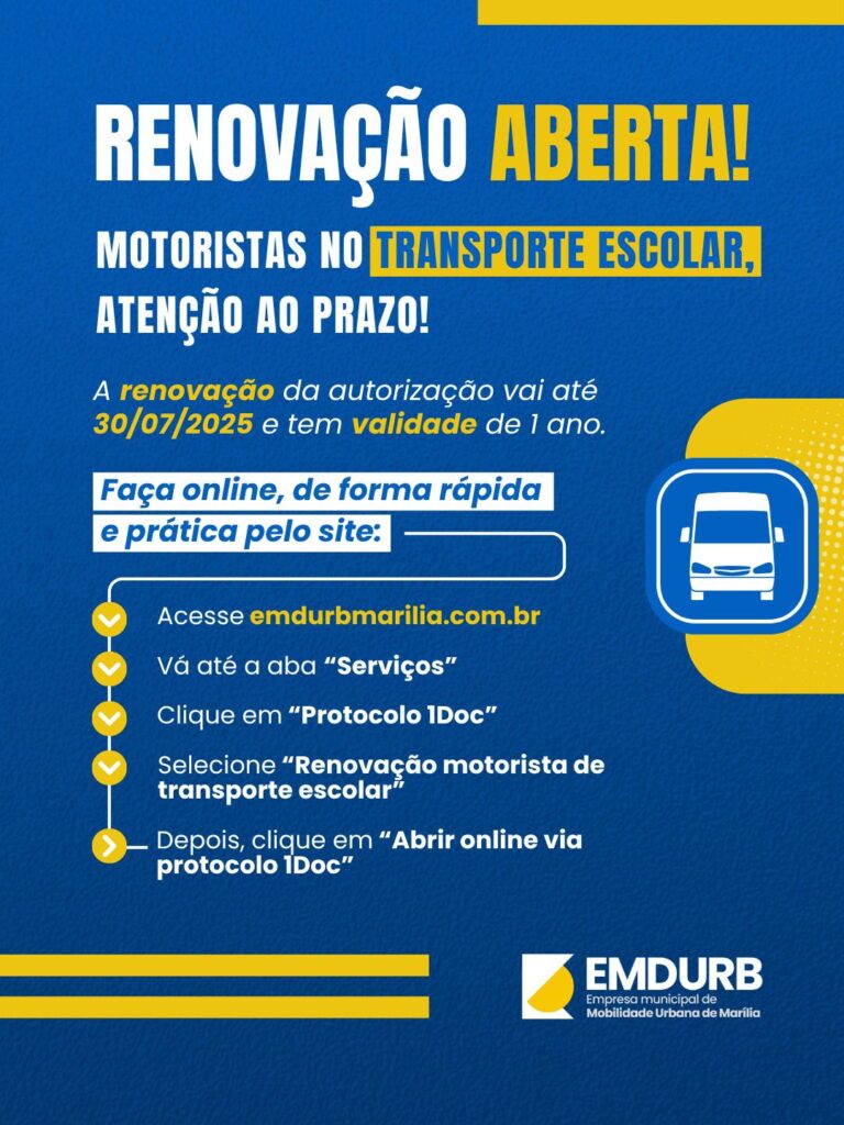 O procedimento pode ser realizado pelo endereço eletrônico www.emdurbmarilia.com.br. Após acessar o site, o motorista deve clicar na aba “Serviços”, escolher “Protocolo 1Doc” e, em seguida, a opção “Renovação motorista de transporte escolar”. A solicitação pode ser aberta diretamente pela plataforma 1Doc.