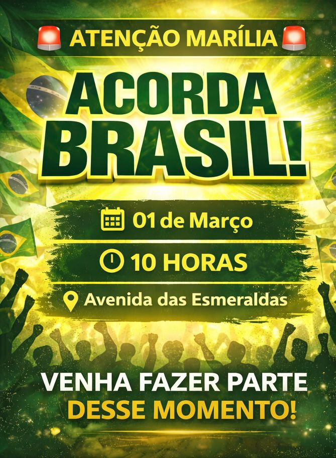 O movimento Acorda Brasil convocou um ato para o dia 1º de março, às 10h, na avenida das Esmeraldas, em Marília. Segundo os organizadores, a manifestação terá como pauta pedidos de impeachment do ministro do Supremo Tribunal Federal (STF) Dias Toffoli, natural da cidade, e críticas ao presidente da República, Luiz Inácio Lula da Silva (PT). O protesto integra mobilização nacional cuja concentração principal está prevista para as 14h, na avenida Paulista, em São Paulo.