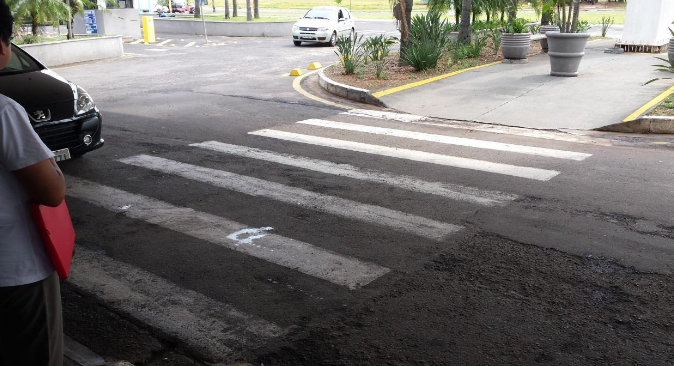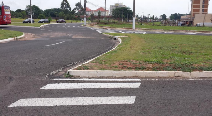 Outra falha observada é que ao final de uma das faixas de pedestres não há piso firme para que os pedestres transitem até a próxima faixa, mas sim grama, o que dificulta ou torna impossível a locomoção das pessoas com mobilidade reduzida.
