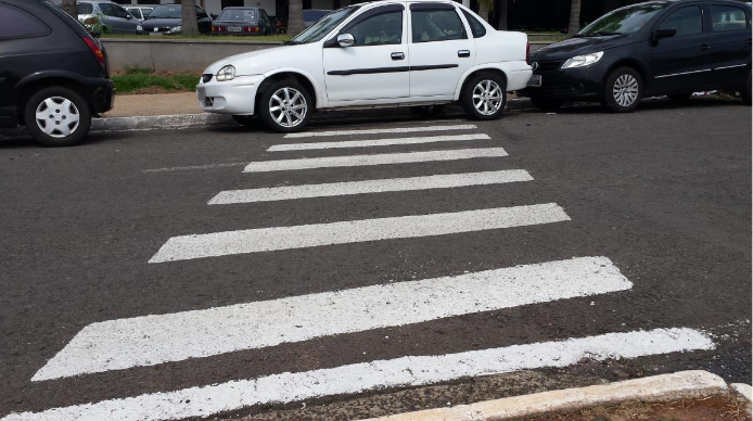 Também foi verificado que na calçada em frente à rodoviária existe uma faixa de pedestres para a atravessar a rua, porém veículos estacionam também sobre a faixa, dificultando a travessia.