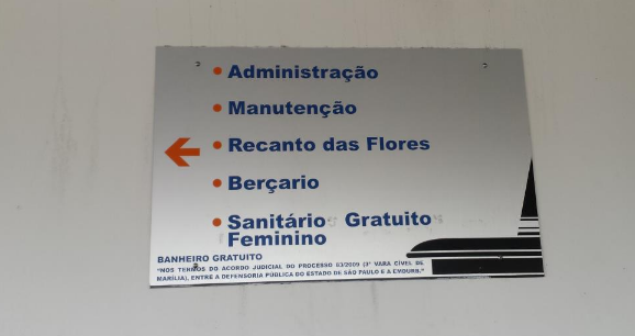Segundo apurou a fiscalização de rotina, existe uma placa informativa fixada na parede indicando para que lado encontra-se a sede da administração da rodoviária. Entretanto não foi possível localizar a sala exata facilmente. Indagado, um dos funcionários da rodoviária indicou a sala correta, cuja porta não tem placa que indique ser ali a sede administrativa.