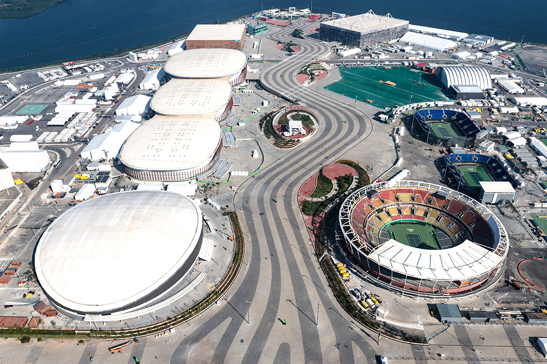 Aerial view of the Olympic Park in Rio de Janeiro, Brazil, on July 26, 2016. The Rio 2016 Olympic and Paralympic Games will be held in Brazil from August 5-21 and September 7-18 respectively. / AFP PHOTO / YASUYOSHI CHIBA