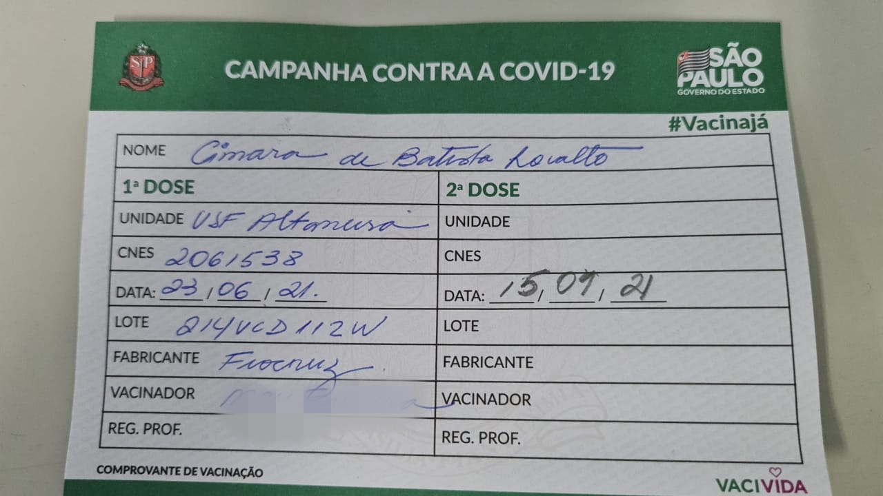 Em entrevista ao Marília Notícia, Cimara conta que chegou ao posto de saúde por volta das 13h30 e assinou alguns papéis, nos quais constava que receberia o imunizante contra a Covid-19 fabricado pela Fiocruz – inclusive a ficha de imunização.