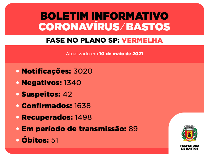 Bastos registra 1.638 casos positivos, sendo 1.498 curados e 51 mortes.