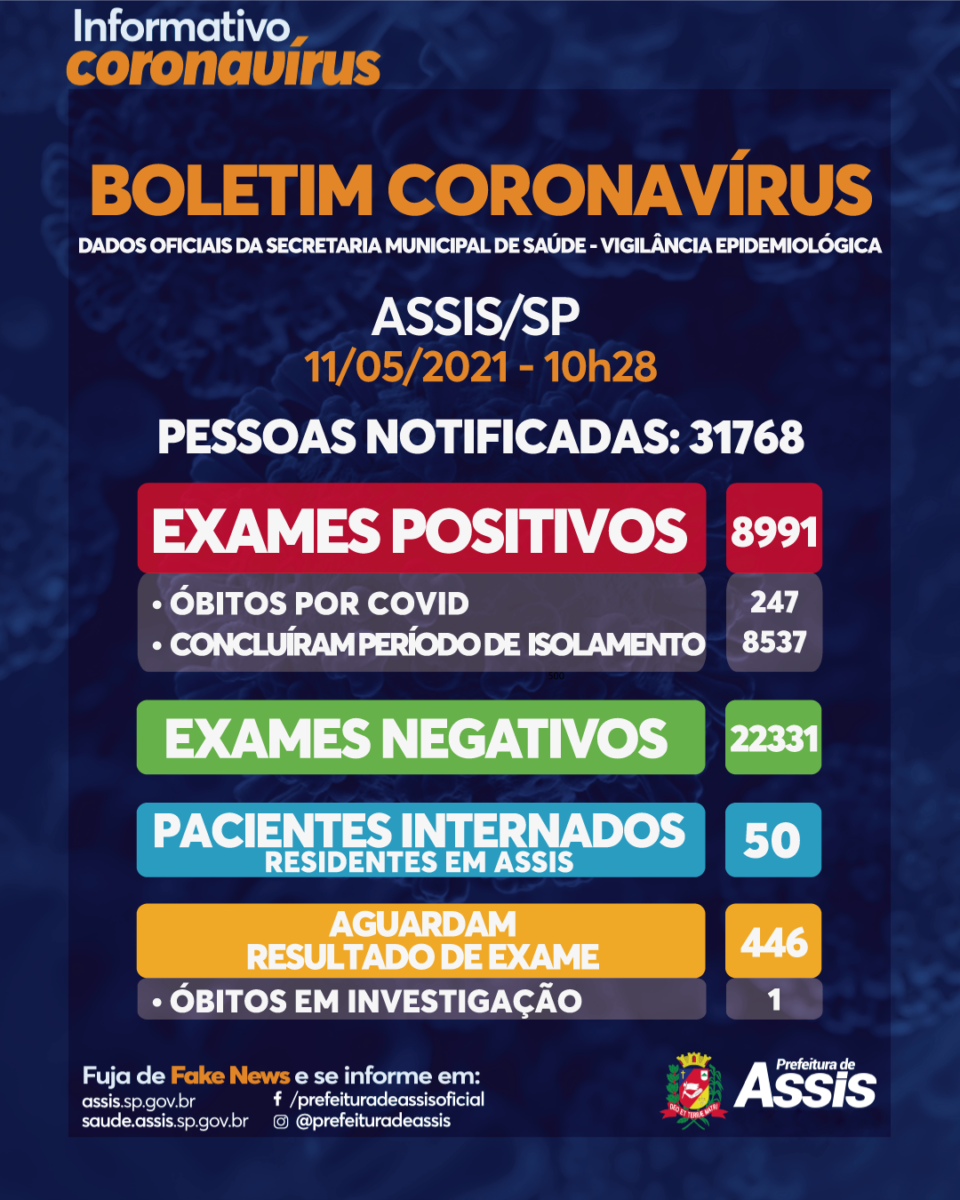 Assis tem 8.991 casos confirmados, dos quais são 8.537 curados e 247 óbitos. Uma morte está em investigação.
