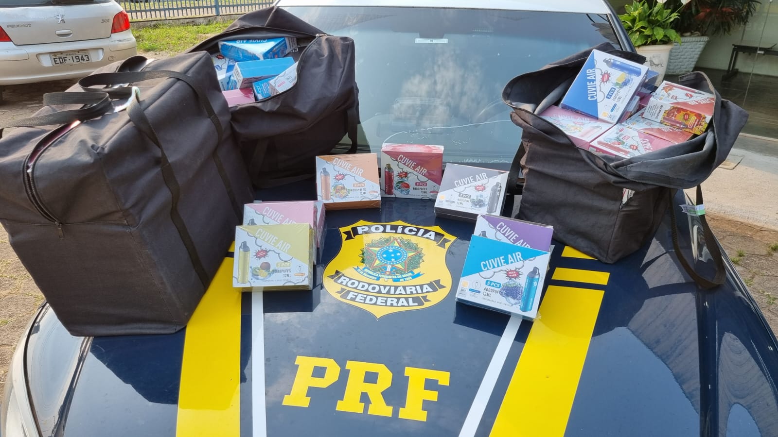 Os policiais fiscalizaram o bagageiro do veículo e notaram que havia três sacolas de lona com diversas caixas de cigarros eletrônicos.