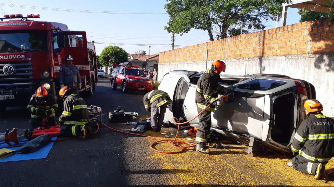O automóvel conduzido pela mulher capotou e ela ficou presa nas ferragens. Os Bombeiros precisaram fazer a a retirada da vítima que sofreu apenas ferimento leves e foi conduzida ao Pronto Socorro do Hospital das Clínicas.