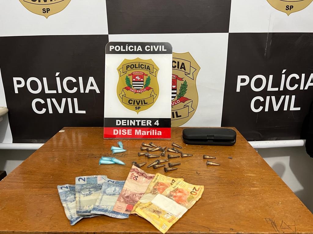 Dentro do imóvel abandonado foram localizados seis pinos com cocaína e 24 com crack, além de R$ 56.