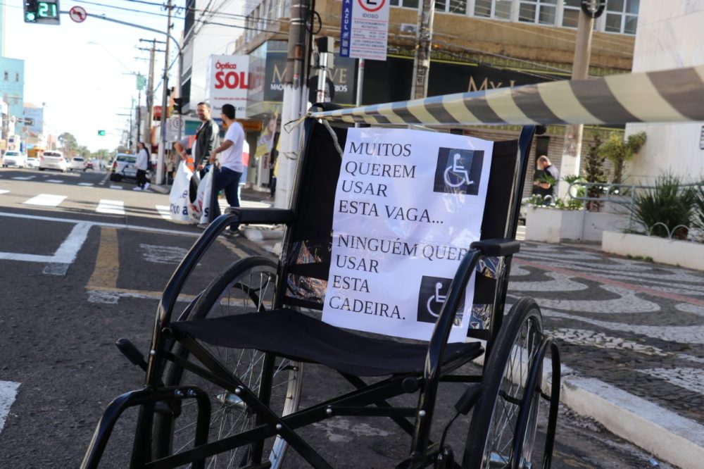Durante a ação, cadeiras de foram colocadas em vagas rotativas de veículos, com o intuito de ilustrar a imprudência dos motoristas que ocupam as vagas destinadas a pessoas com mobilidade reduzida e a idosos.