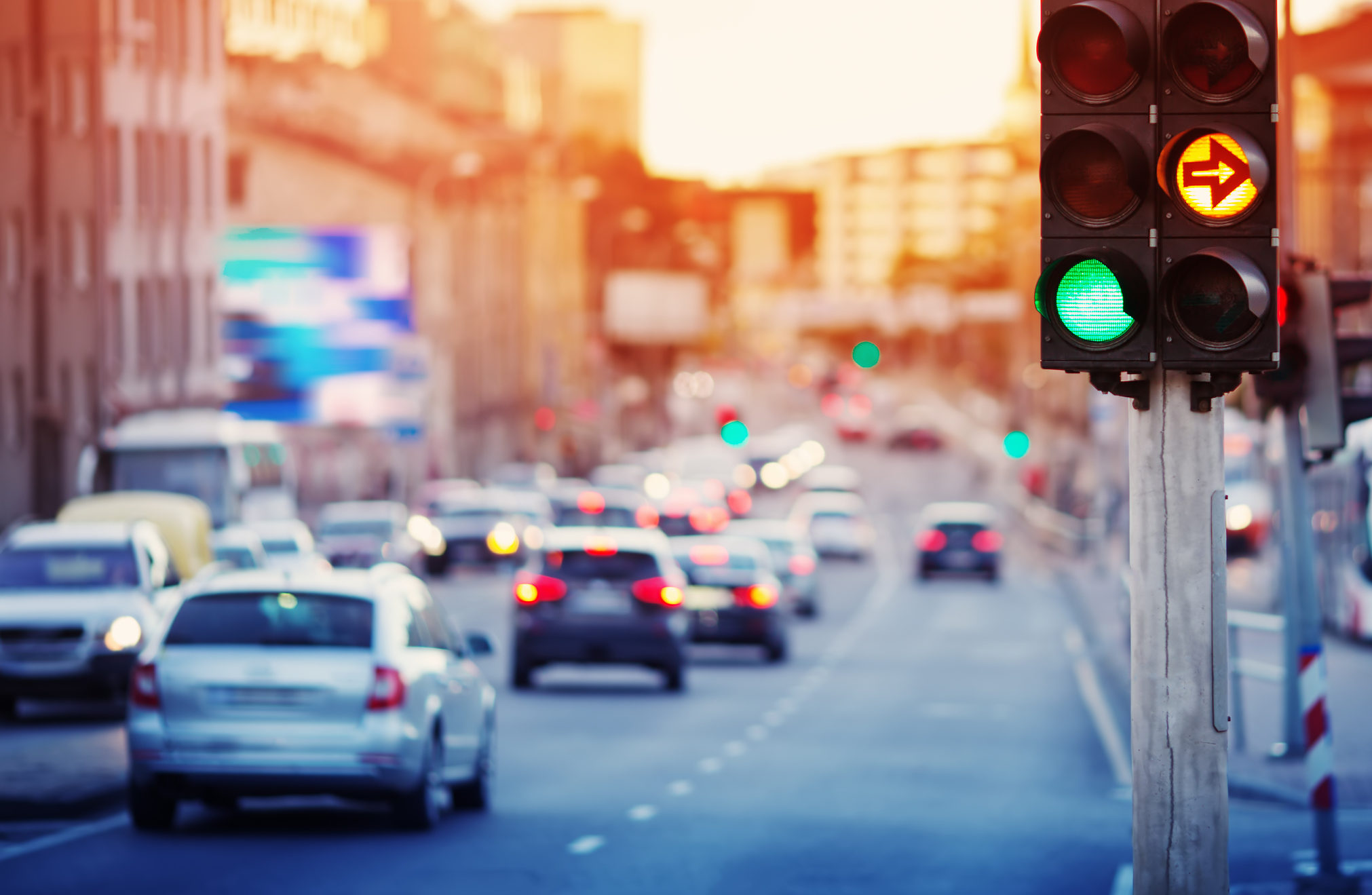 Cars moving on the road in city in late evening. View to the traffic with trafficlights and transport