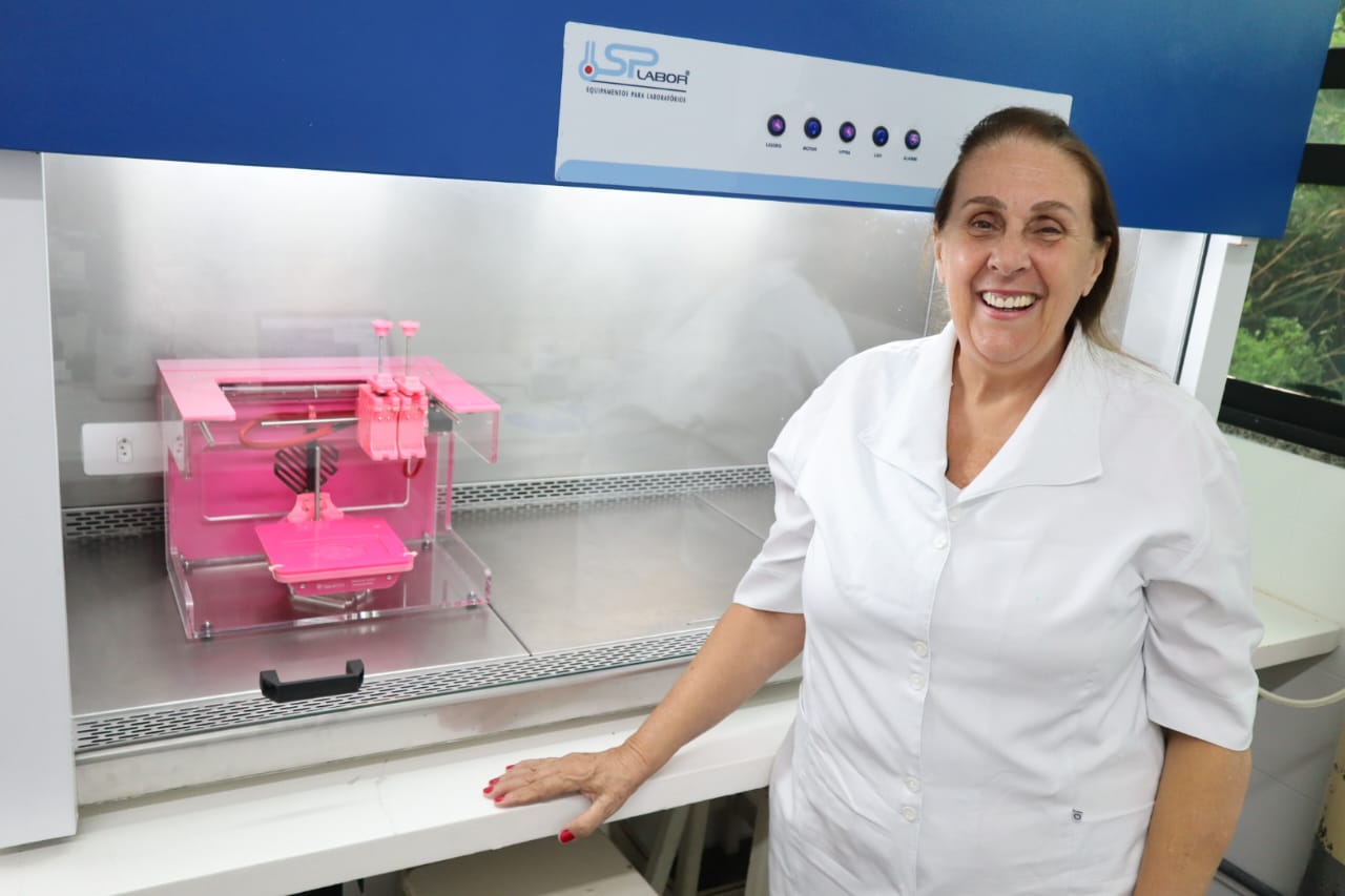 Maria Angélica Miglino – Nós temos aqui um conjunto de dois laboratórios, um que é uma área menos limpa e o outro que é uma área mais limpa, onde fica a bioimpressora. O objetivo é preparar material dentro da técnica que chamamos de engenharia de tecidos e órgãos. Essa técnica é fundamental para uma área chamada medicina regenerativa, que veio para substituir, com muita categoria, os transplantes.