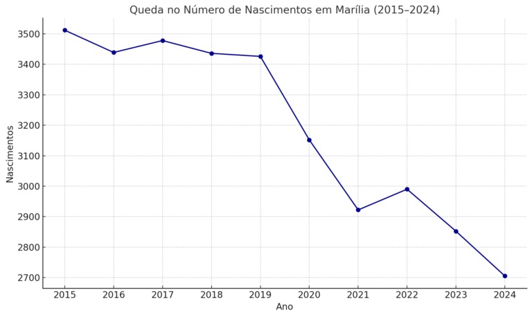 O número de nascimentos em Marília vem apresentando uma queda contínua ao longo da última década, seguindo uma tendência nacional. Dados do Portal da Transparência do Registro Civil mostram que, entre 2015 e 2024, os registros de nascidos vivos caíram de 3.512 para 2.705 – uma redução de 22,98%.