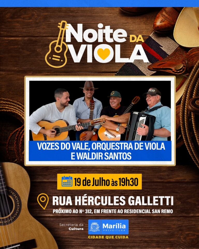 A Prefeitura de Marília promove neste sábado (19), às 19h30, mais uma edição do evento Noite da Viola. A apresentação será realizada na rua Hércules Galletti, próximo ao número 312, em frente ao Residencial San Remo, na zona Oeste da cidade.