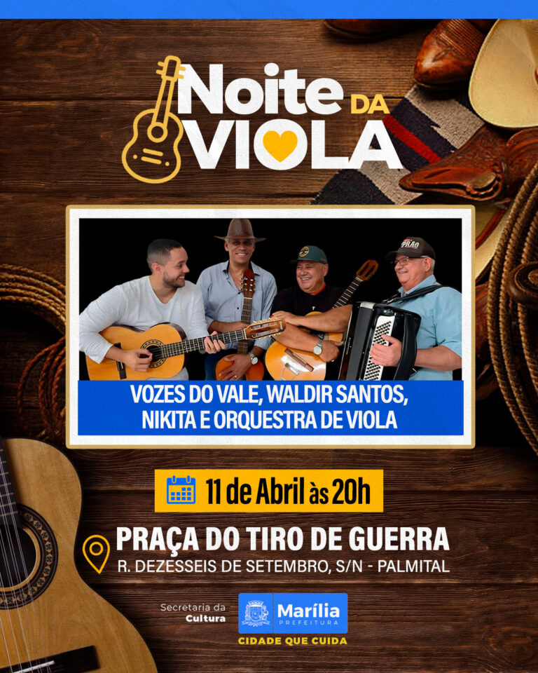 A Secretaria Municipal da Cultura realiza neste sábado (11), a partir das 20h, a Noite da Viola na praça do Tiro de Guerra, na zona norte de Marília. O evento é gratuito e aberto ao público.