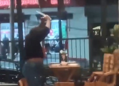 As imagens mostram parte do ataque de fúria. Mesas e cadeiras da pizzaria foram derrubadas; pratos lançados ao chão, enquanto a mulher gritava ameaças contra o ex-marido, com uma faca na mão.