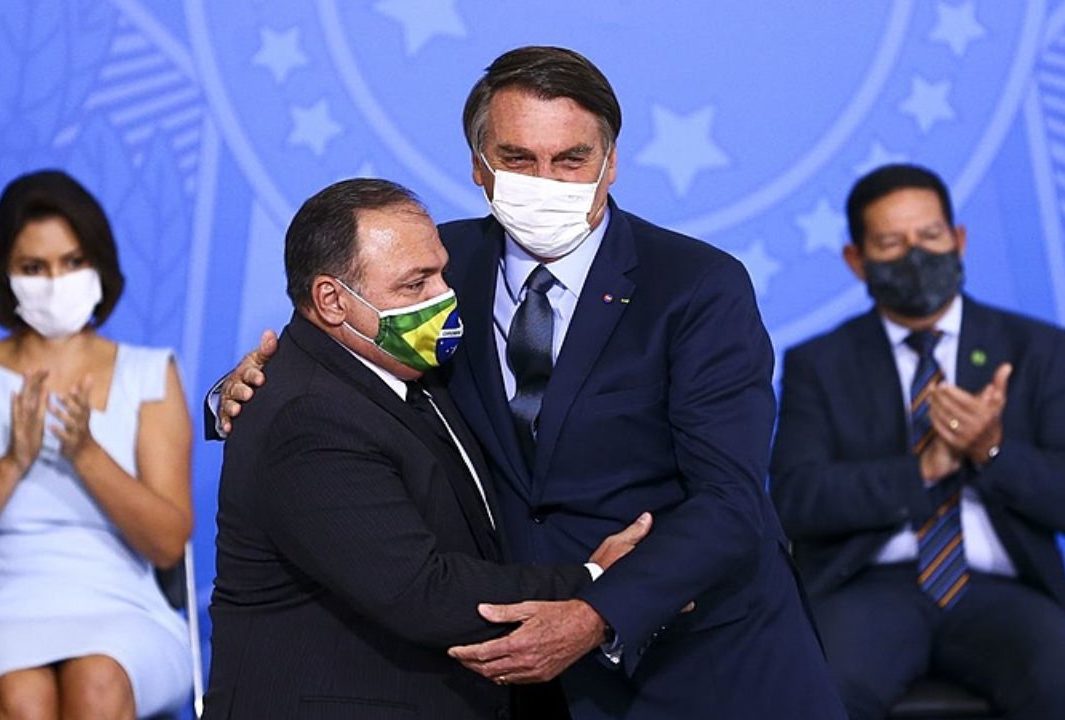 O presidente Jair Bolsonaro dá posse ao ministro da Saúde, Eduardo Pazuello, no Palácio do Planalto.
