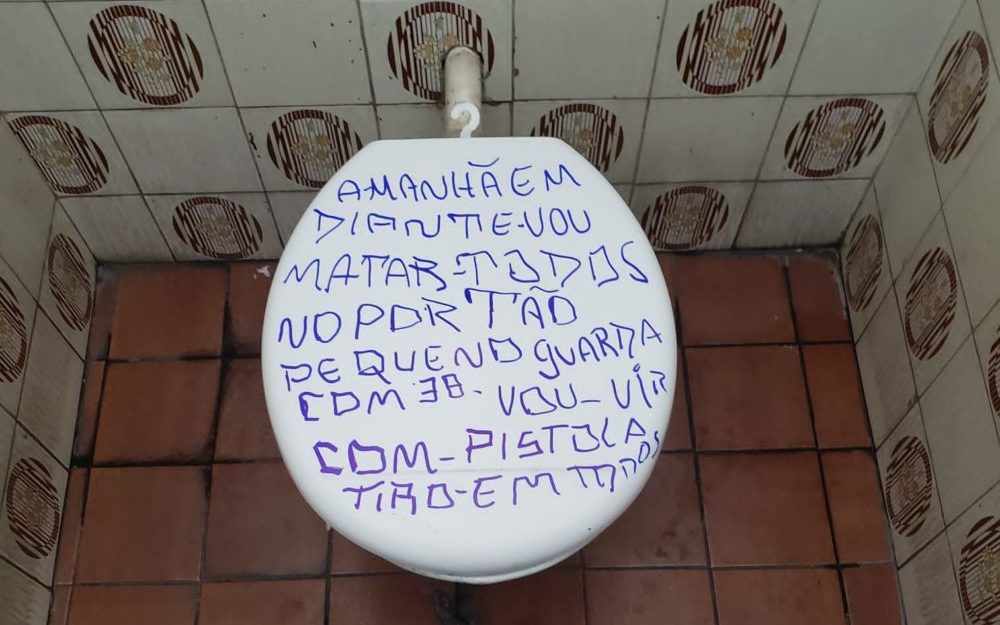 A mensagem, que teria sido escrita nesta segunda-feira (24), diz “amanhã em diante vou matar todos no portão pequeno com 38. Guarda. Vou vir com pistola. Tiro em todos”.