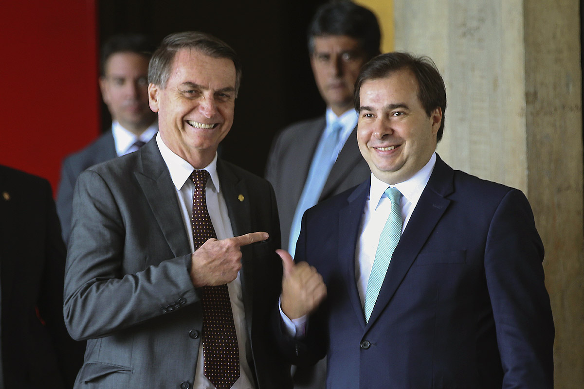 O presidente eleito, Jair Bolsonaro, acompanha o presidente da Câmara dos Deputados, Rodrigo Maia até o carro no CCBB.